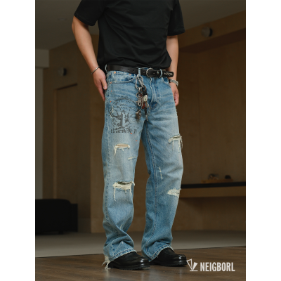 【Broken corner ticket】NEIGBORL Uncle Zhao American style vintage print washed old destruction loose jeans